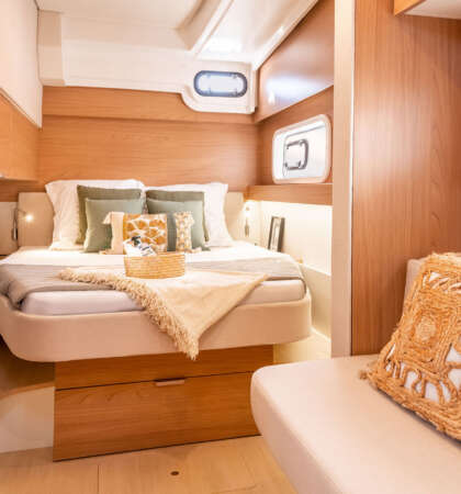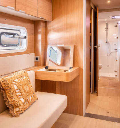 - Cabinas principales (opciones 3 y 4 cabinas): Camarotes con camas dobles, amplios espacios de almacenamiento y baños privados.