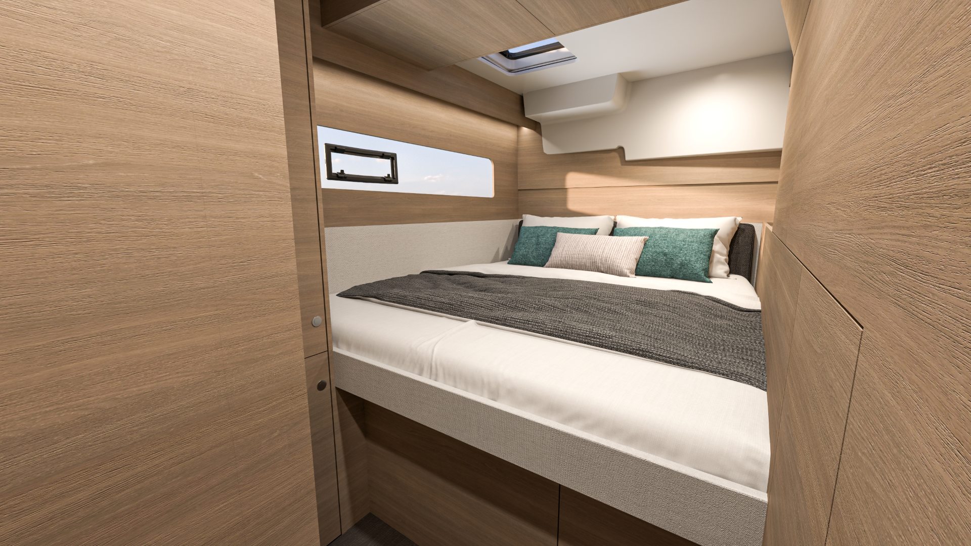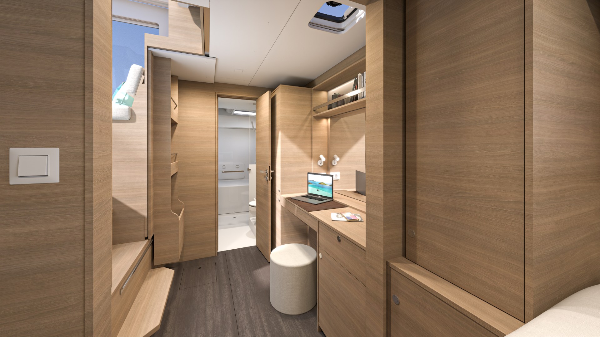 El camarote del armador ofrece una litera espaciosa, almacenamiento generoso y un baño privado, garantizando privacidad y tranquilidad a bordo.