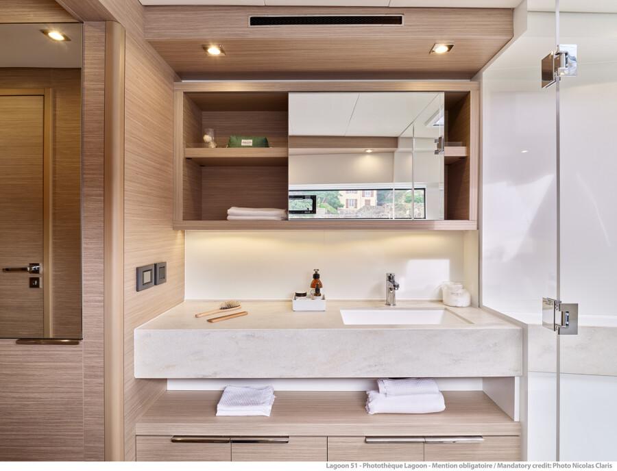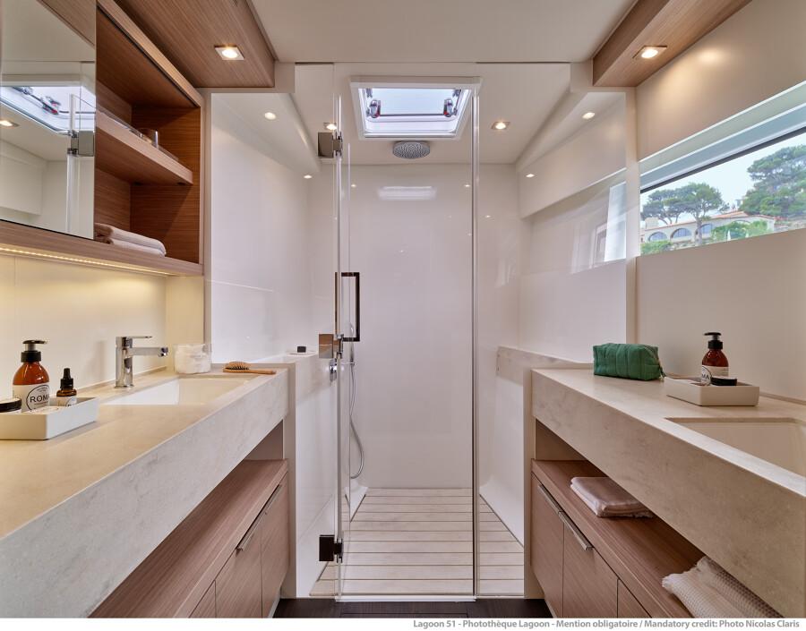 Cada uno de los camarotes del Lagoon 51 está equipado con baño privado y espacios generosos, lo que garantiza privacidad y comodidad. Los baños están bien equipados y los camarotes cuentan con excelente ventilación y almacenamiento, asegurando una estancia cómoda.