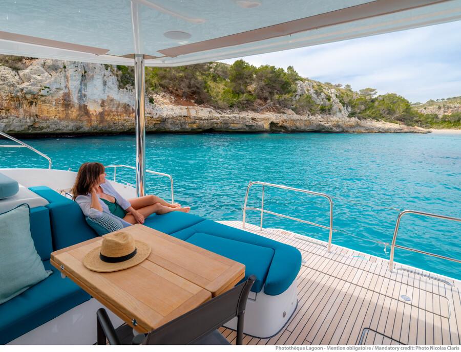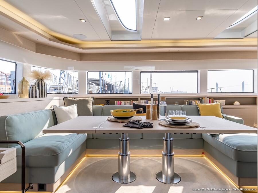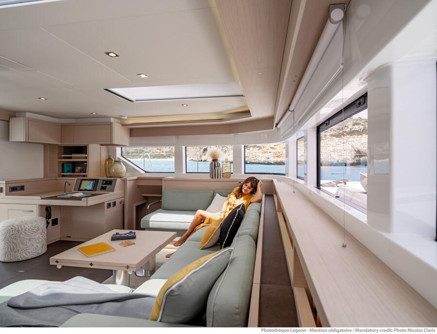 Gracias a su generosa manga y un diseño cuidadosamente distribuido, el Lagoon 55 ofrece un interior luminoso y acogedor, con amplias zonas de estar y descanso que maximizan la habitabilidad.