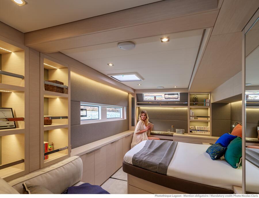 Las cabinas del Lagoon 55 han sido diseñadas para ofrecer lujo y privacidad, con camas amplias, gran capacidad de almacenamiento y baños privados, asegurando un descanso placentero a bordo.