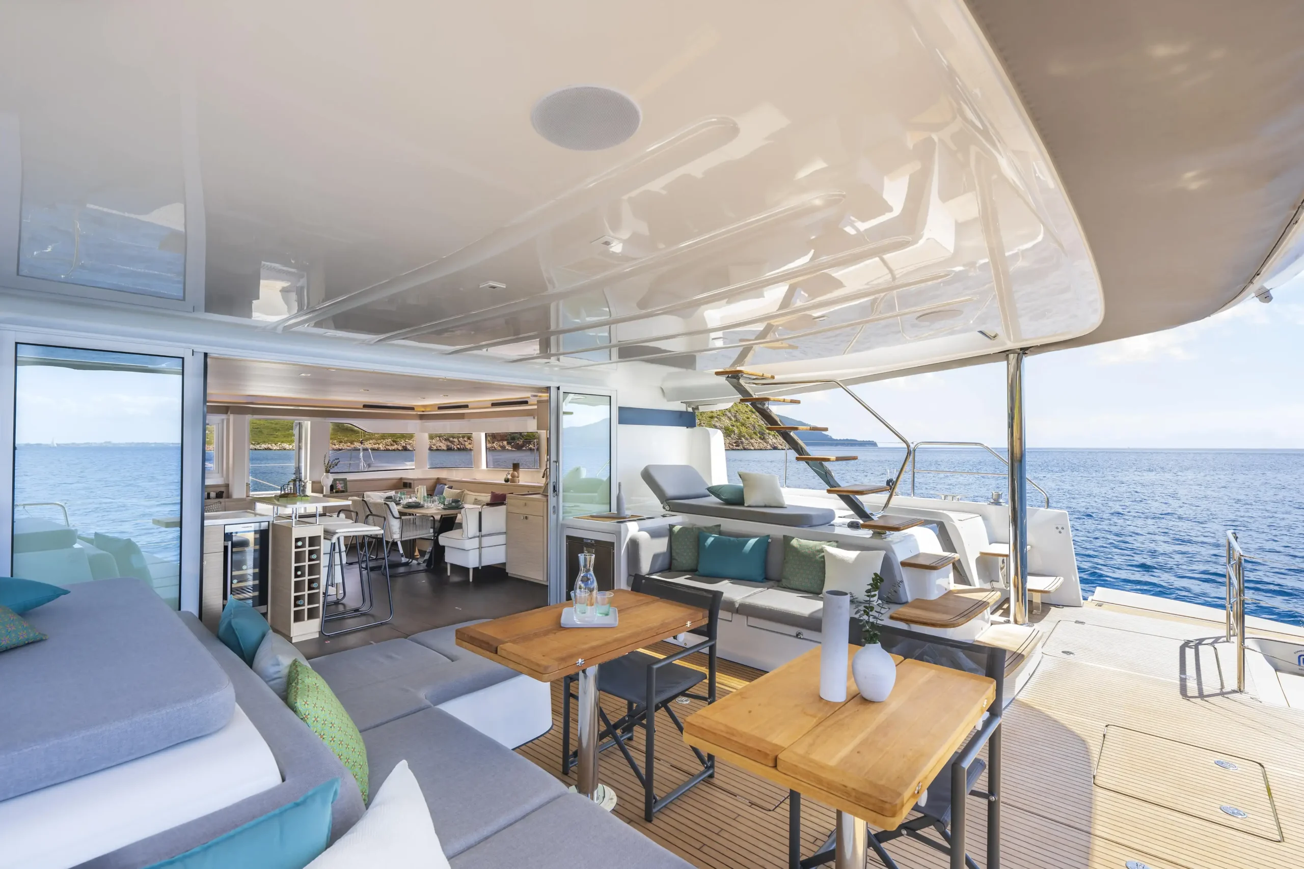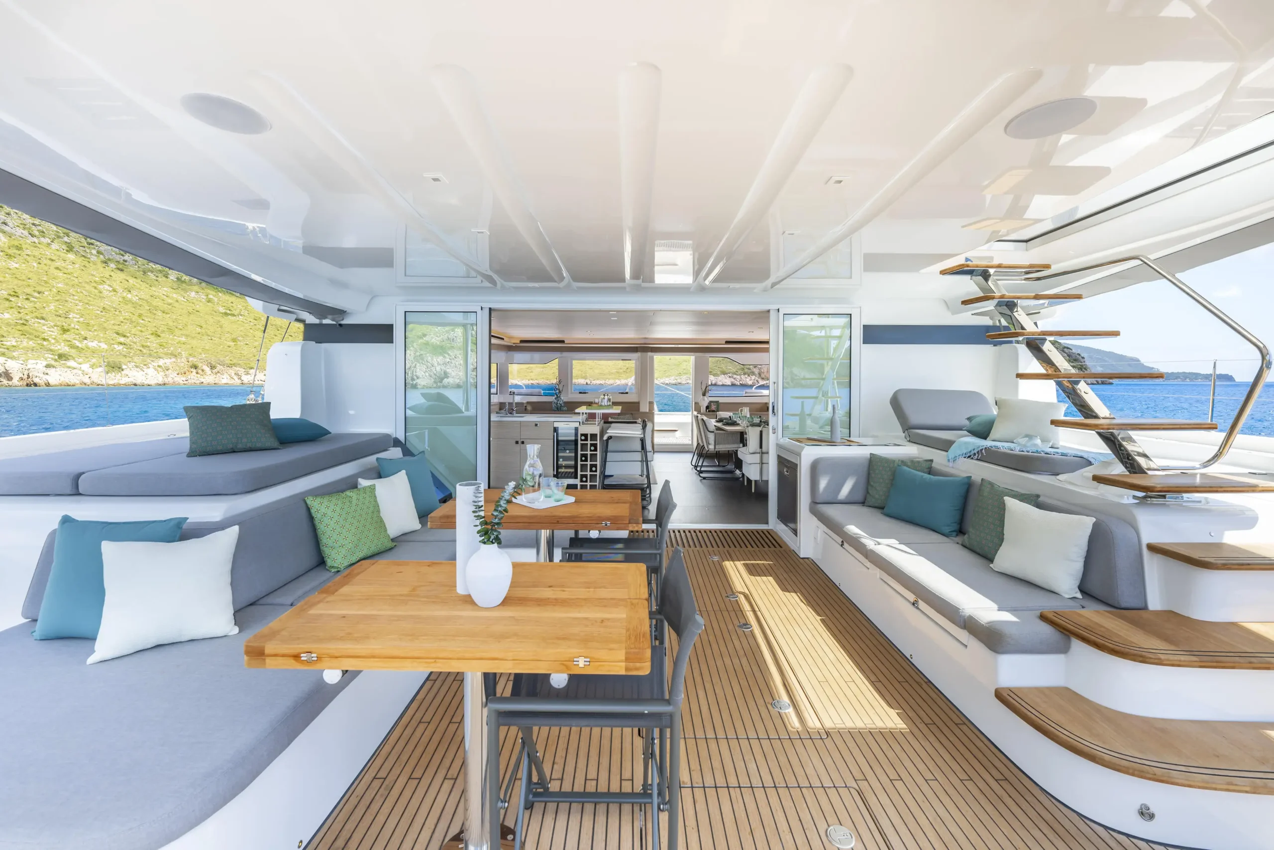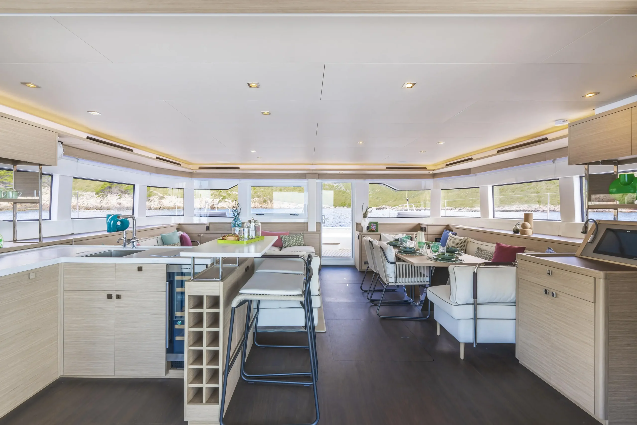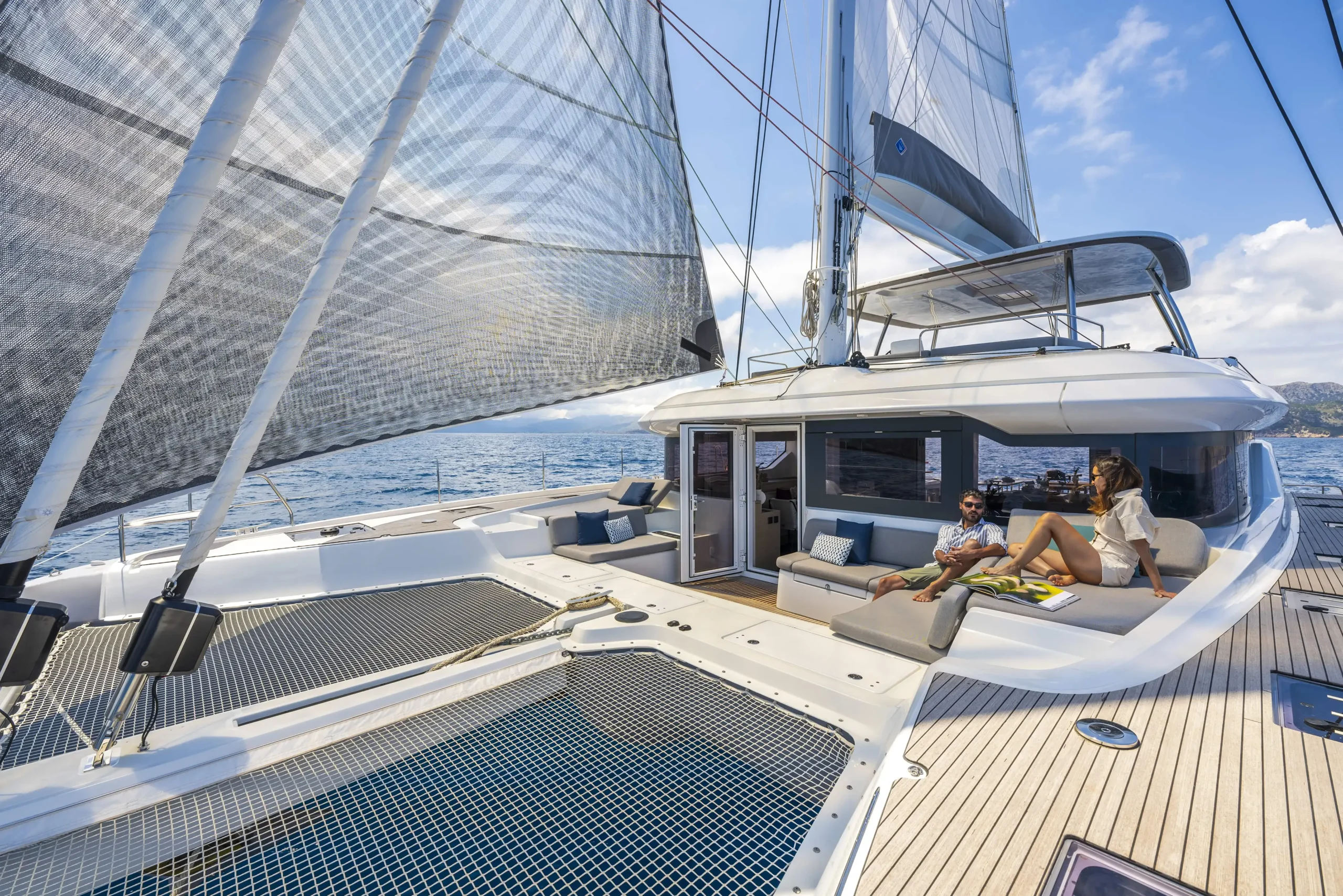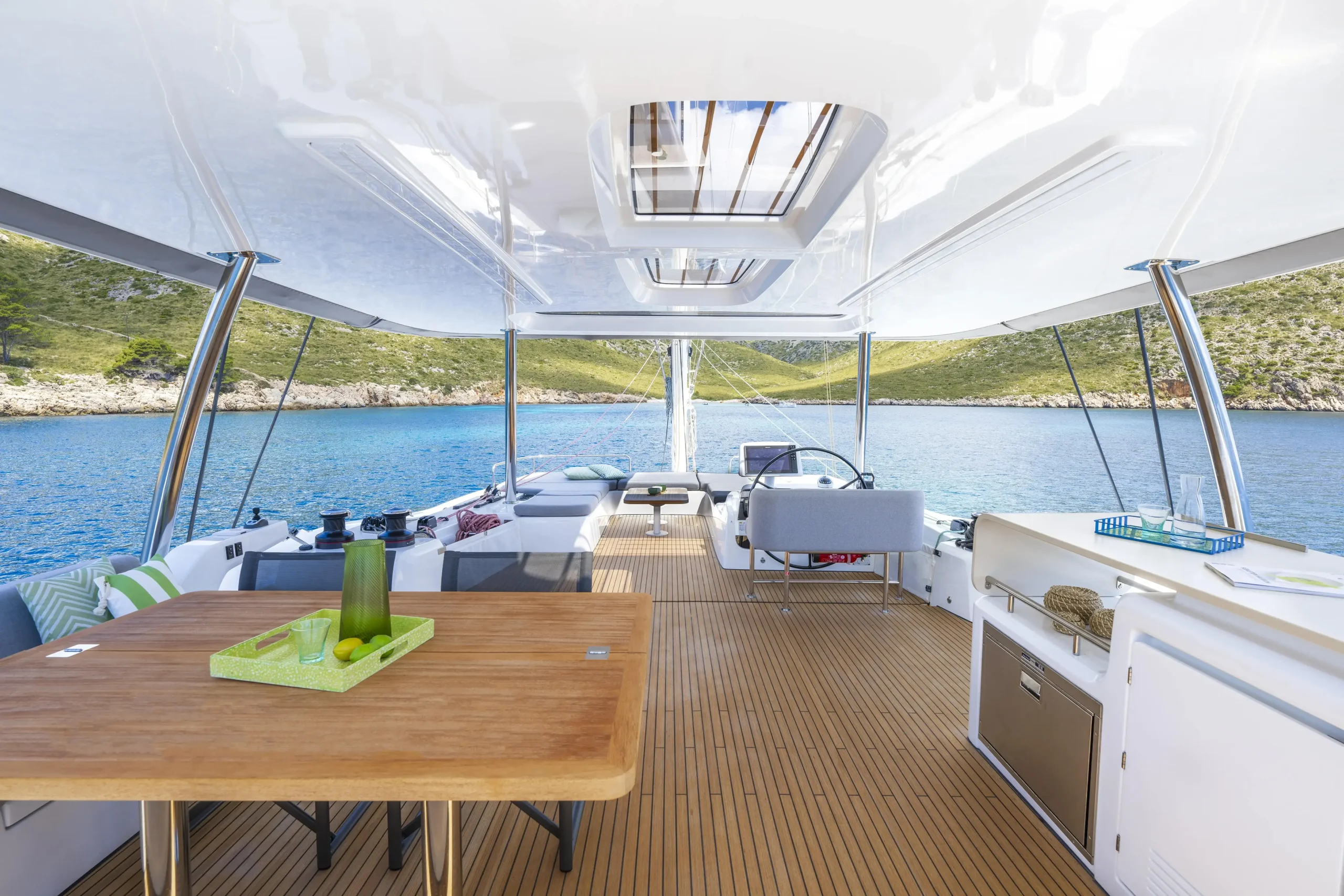 El Lagoon 60 destaca por su distribución inteligente, con una bañera de popa completamente abierta al mar y acceso directo desde proa. Sus amplias zonas exteriores e interiores maximizan la comodidad y la convivencia a bordo.