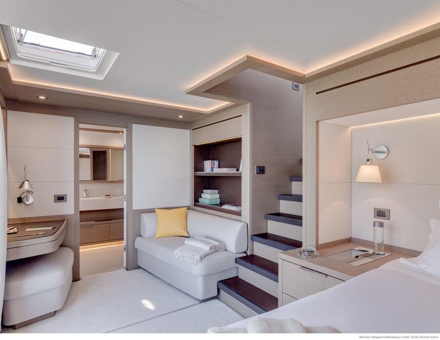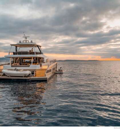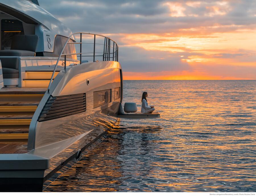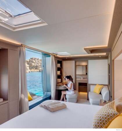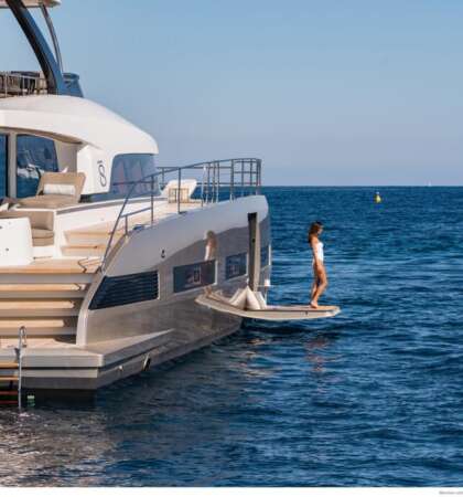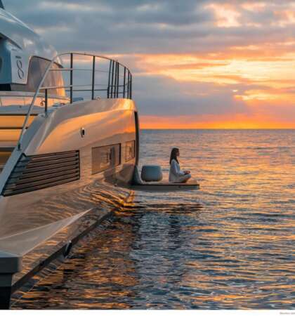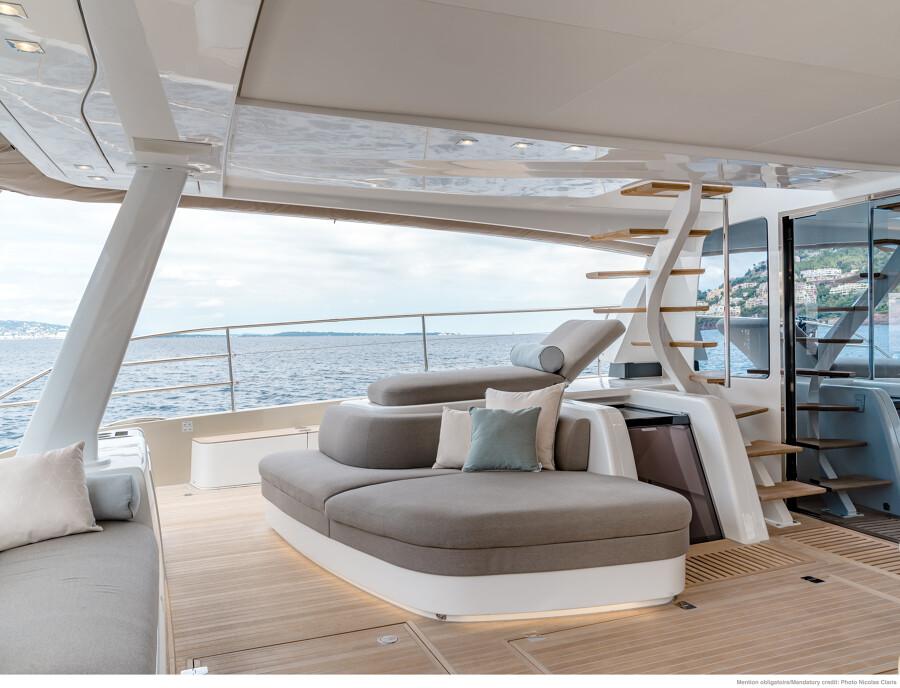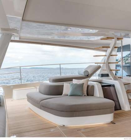 Su cubierta y salón ofrecen un diseño abierto con vistas panorámicas, proporcionando una sensación de amplitud y lujo inigualable.