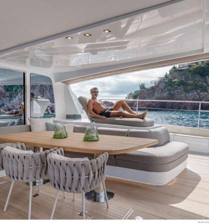 Cubierta amplia con zona de descanso, comedor al aire libre y acceso directo al mar para mayor disfrute.