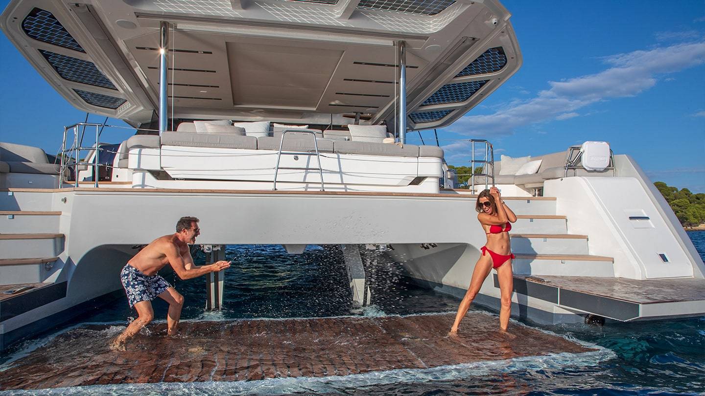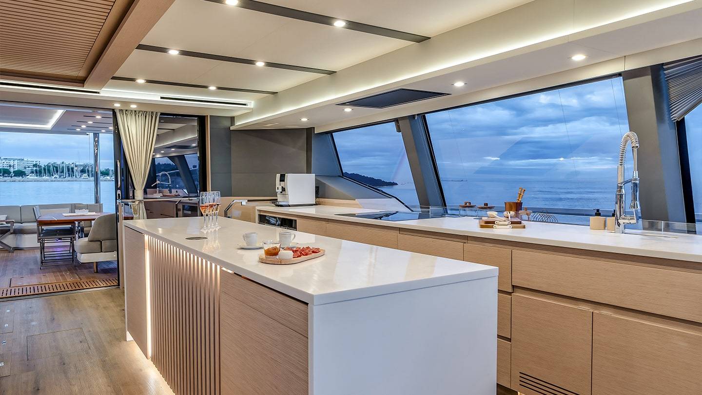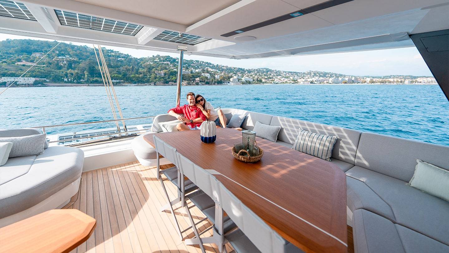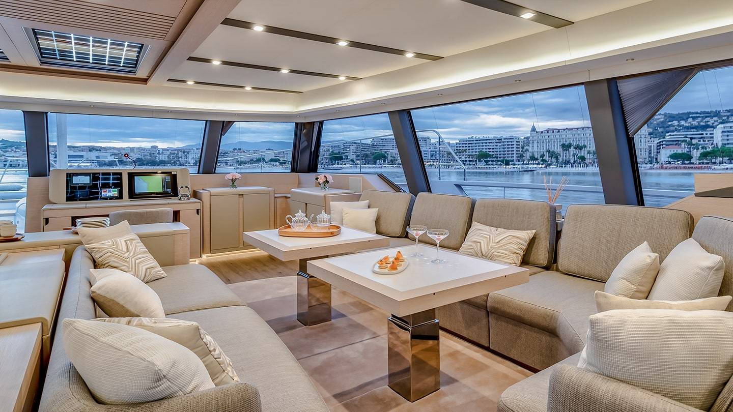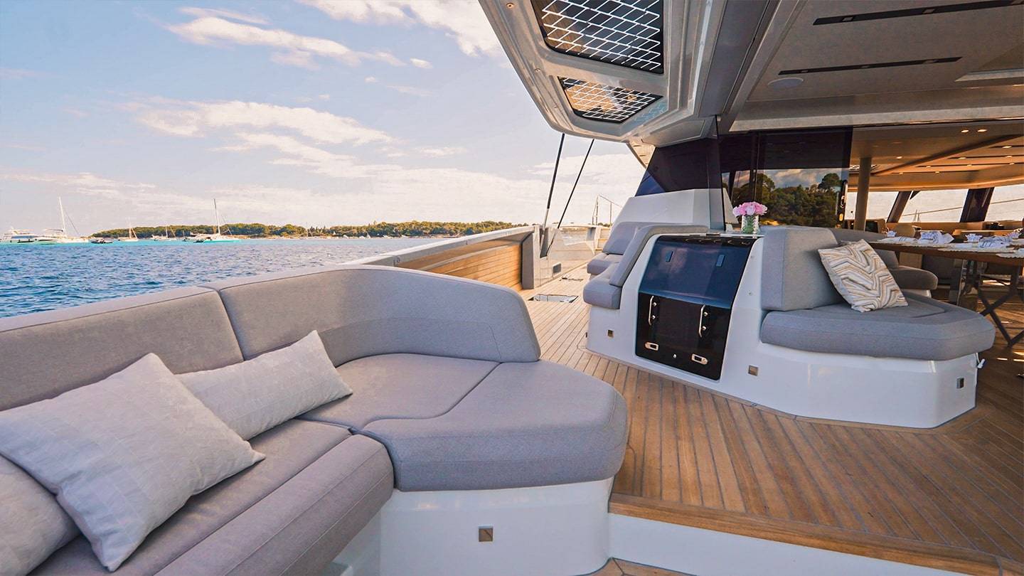 El catamarán cuenta con amplias zonas de estar en la cubierta, un flybridge excepcional, y varios espacios de ocio para disfrutar del mar en total confort.